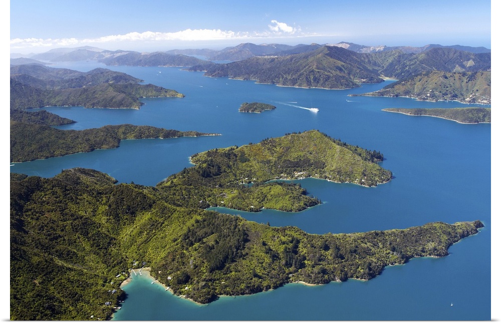 <p>Lochmara Bay (bottom), Double Bay (right), Torea Bay (left) and Queen Charlotte Sound, Marlborough Sounds, South Island, New Zealand - aerial</p>