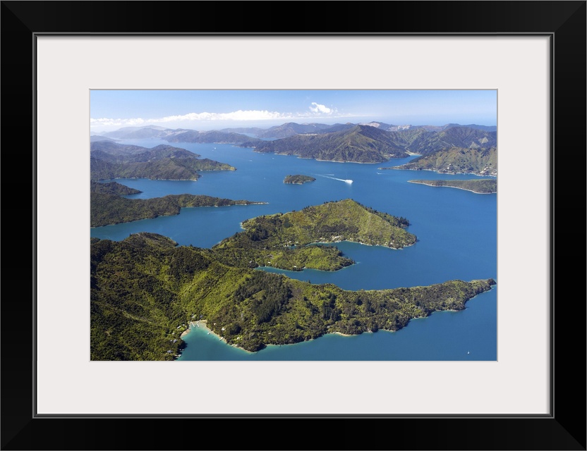 <p>Lochmara Bay (bottom), Double Bay (right), Torea Bay (left) and Queen Charlotte Sound, Marlborough Sounds, South Island, New Zealand - aerial</p>