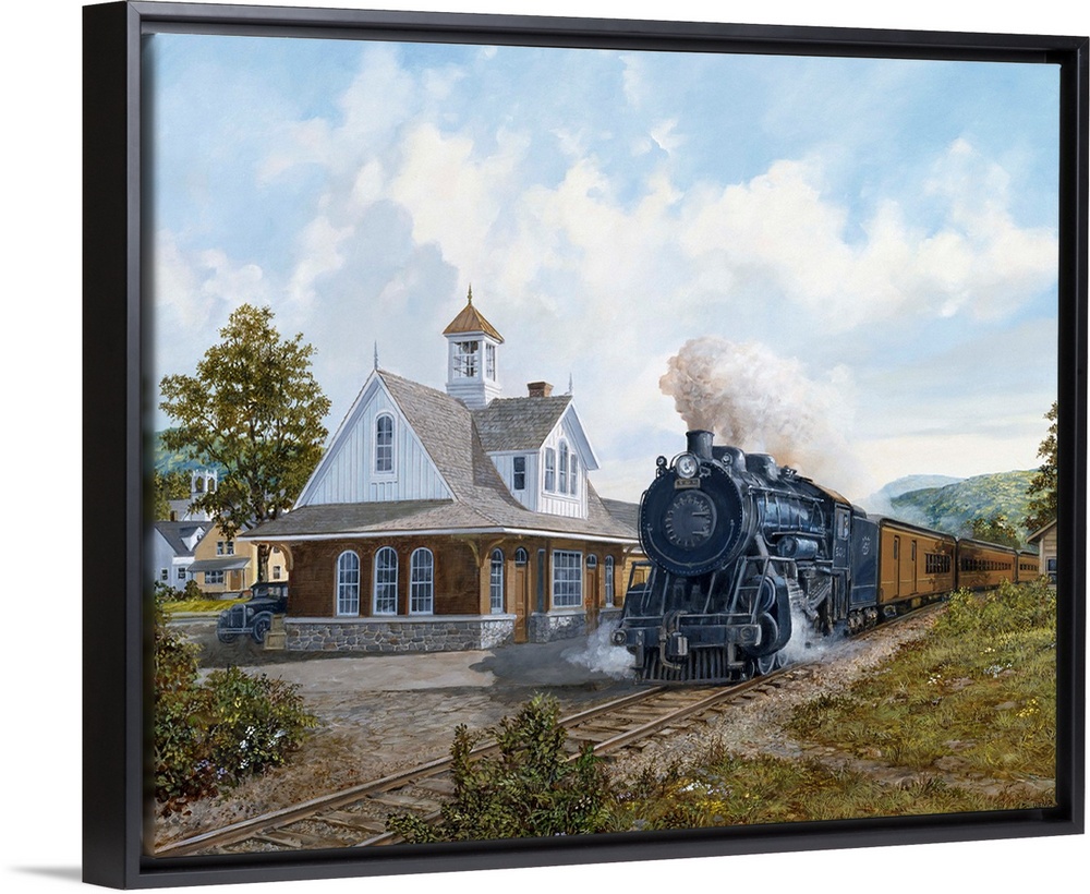 <p>Painting of a train pulling into the station in a rural area.</p>