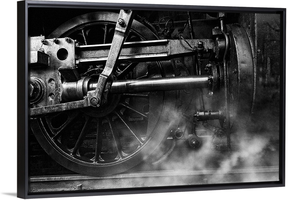 <p>Steam rising from the pistons near the wheels of a train locomotive.</p>