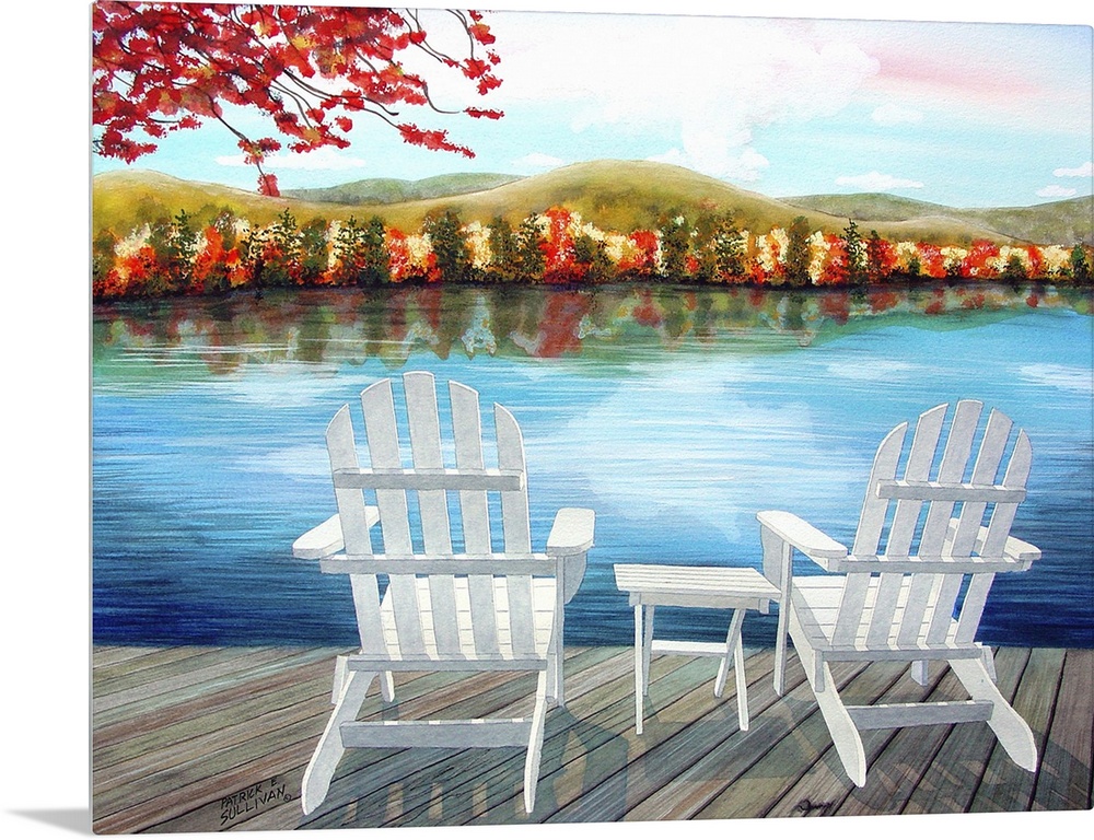 <p>White chairs on a deck overlooking a lake and the autumn foliage.</p>