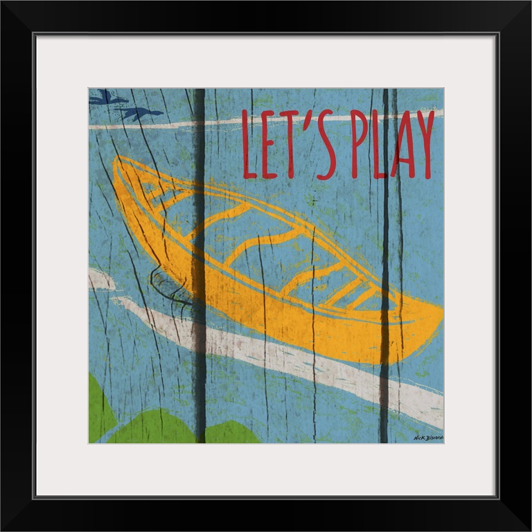 <p>Brightly colored image of a canoe in the water with a wooden board texture.</p>