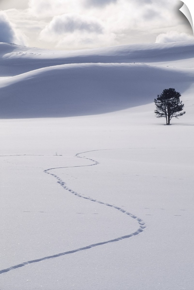 <p>A lone lodgepole pine tree (Pinus contorta) and coyote tracks in fresh snow Yellowstone National Park, Wyoming, United States of America</p>