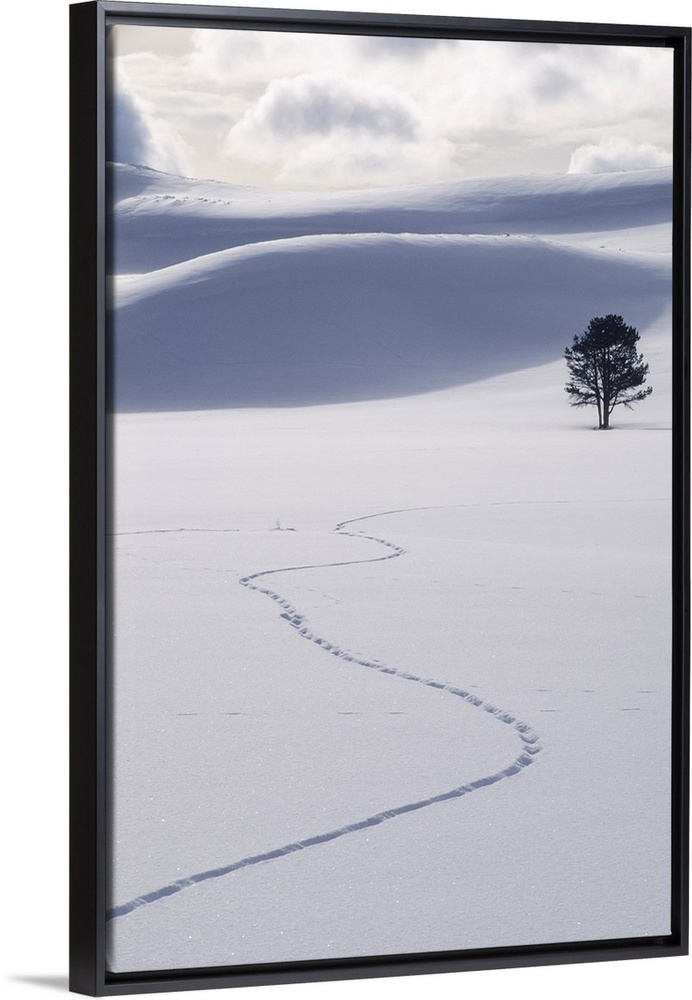 <p>A lone lodgepole pine tree (Pinus contorta) and coyote tracks in fresh snow Yellowstone National Park, Wyoming, United States of America</p>