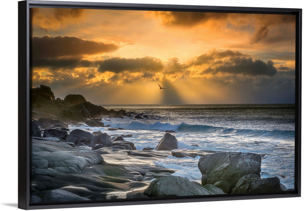 <p>Rocky coast of Lofoten, Norway, at sunset.</p>