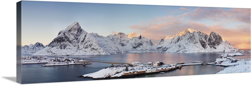 <p>Panaromic view of Reina and Hamnoy at the end of Lofoten Islands during winter sunset. Two villages are made up of numerous islands connected by bridges. The area is surrounded by majestic granite mountains rising straight up from the sea.This is taken from a small hill overlooking the area.</p>