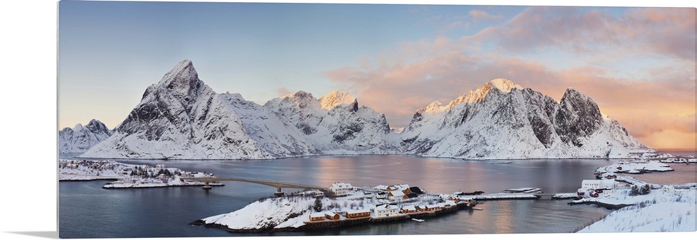 <p>Panaromic view of Reina and Hamnoy at the end of Lofoten Islands during winter sunset. Two villages are made up of numerous islands connected by bridges. The area is surrounded by majestic granite mountains rising straight up from the sea.This is taken from a small hill overlooking the area.</p>