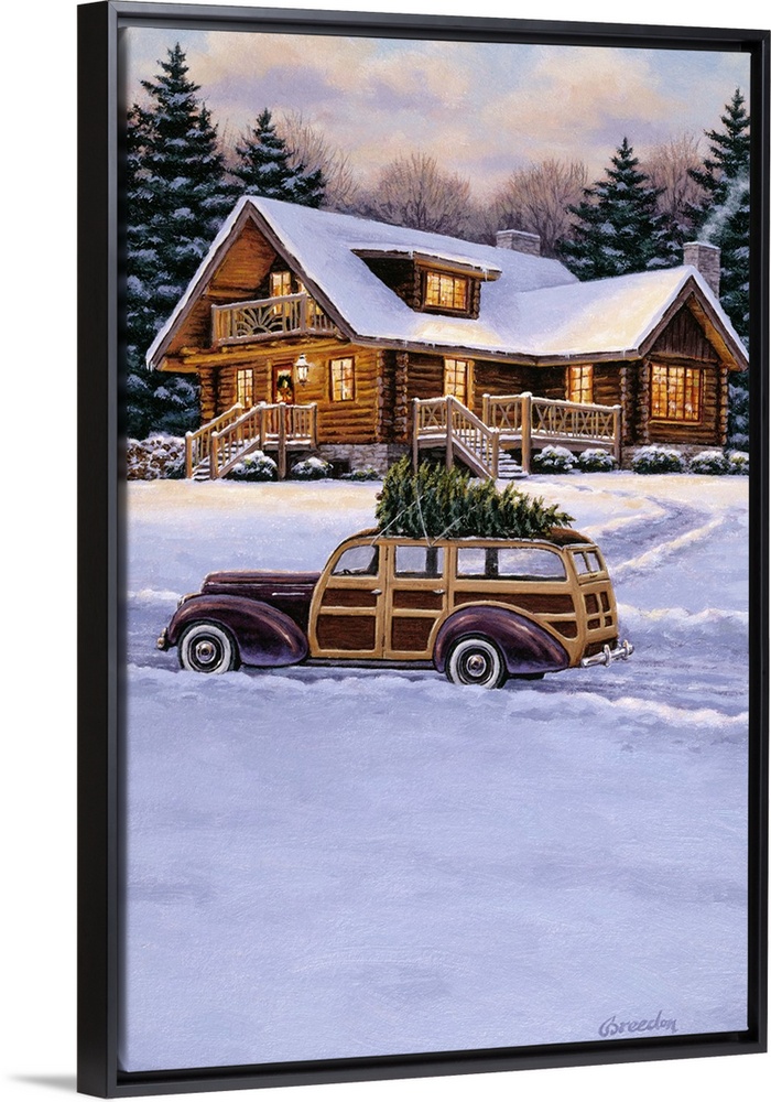 <p>An old woody station wagon, with a christmas tree on top, parked in front of a log cabin with a wreath on the door.</p>