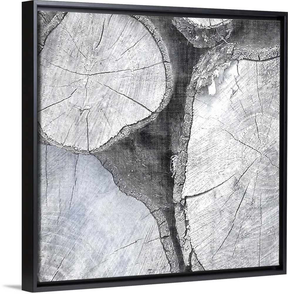 <p>Abstract artwork in grey shades made from cross sections of tree trunks.</p>