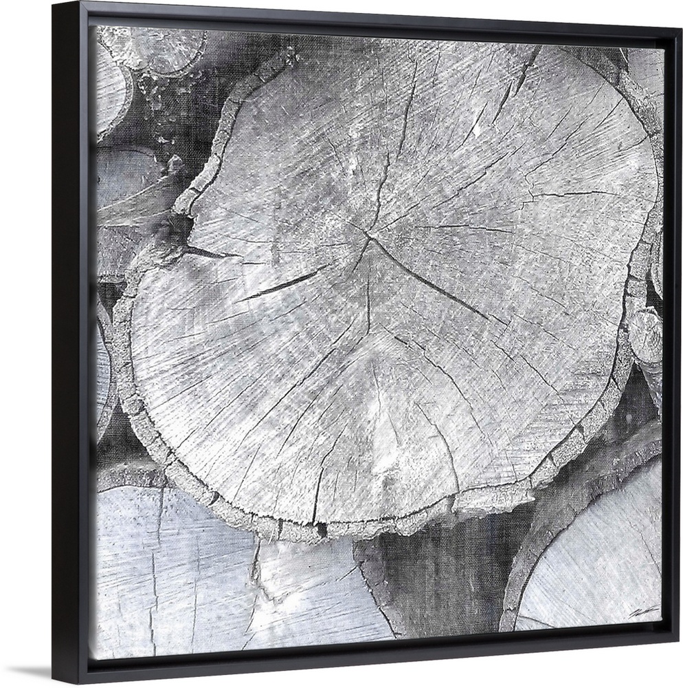 <p>Abstract artwork in grey shades made from cross sections of tree trunks.</p>