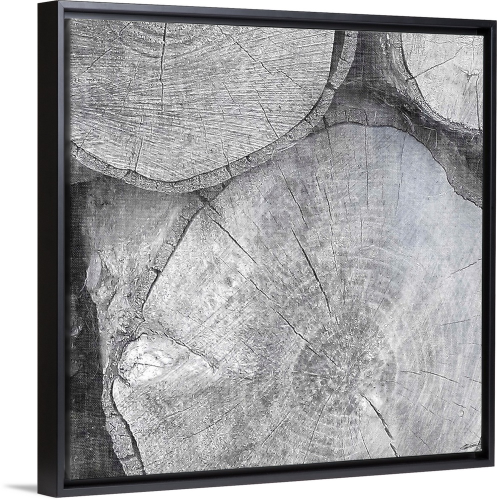 <p>Abstract artwork in grey shades made from cross sections of tree trunks.</p>