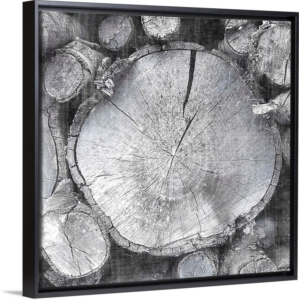 <p>Abstract artwork in grey shades made from cross sections of tree trunks.</p>