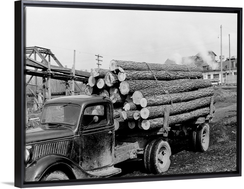 <p>A logging truck parks at the Camp Lumber Company with a load of small pine logs. The logs are 900 board feet by the Doyle Rule, but will saw at 1,800 board feet. The price at that time was $11 a thousand board feet by the Doyle Rule. Franklin, Virginia, USA.</p>