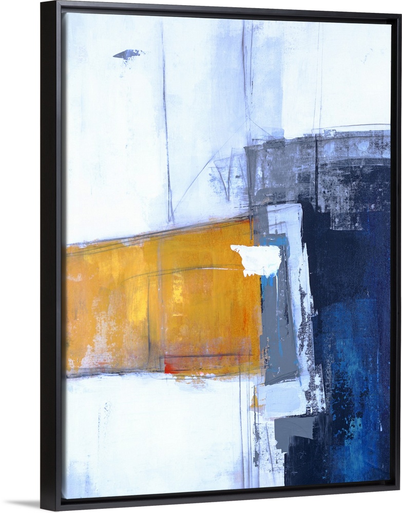 <p>Contemporary abstract painting with bold shapes in dark blue and yellow on a light blue background with thin lines.</p>