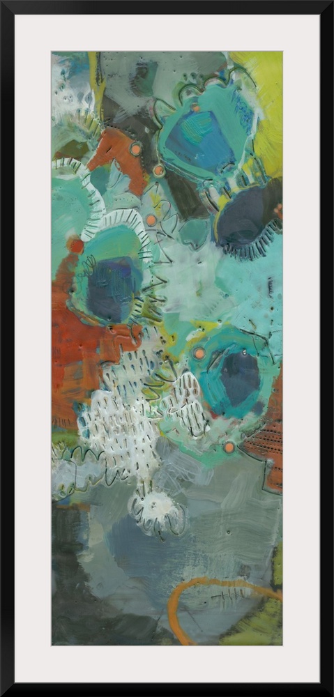 <p>This contemporary artwork features mottled areas of bright color with textured lines and dots that exemplifies an industrial chic style</p>