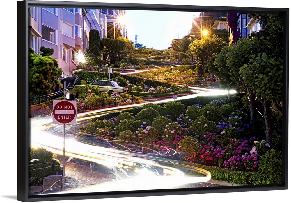 <p>Time lapse photo of light trails illuminates the switchbacks on Lombard Street.</p>