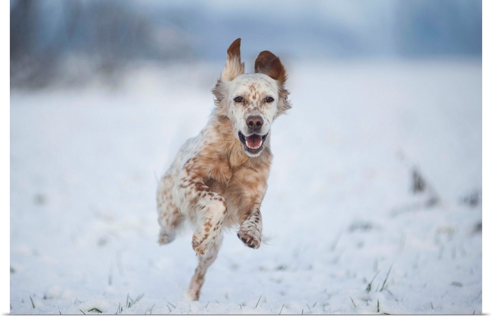 <p>Lombardy, Italy, Europe. An english setter dog is running on a snow covered field.</p>