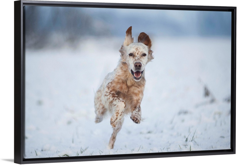 <p>Lombardy, Italy, Europe. An english setter dog is running on a snow covered field.</p>
