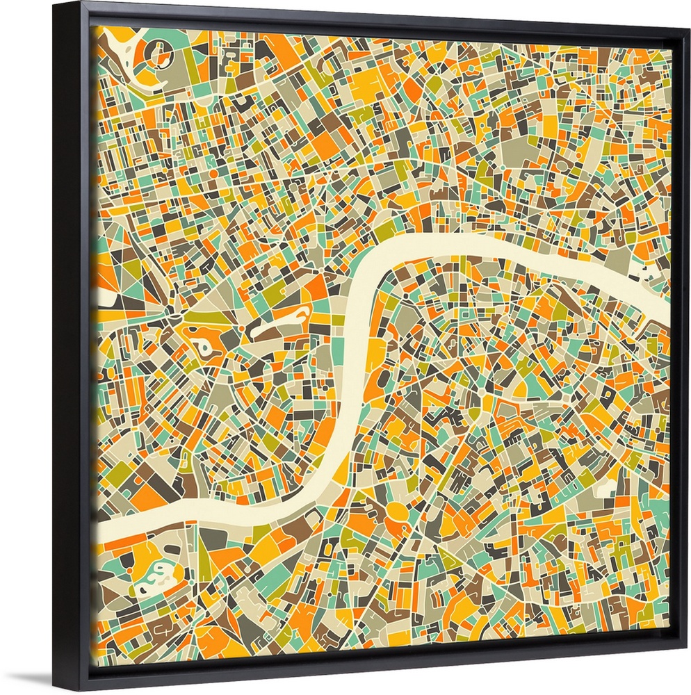 <p>Colorfully illustrated aerial street map of London, England on a square background.</p>