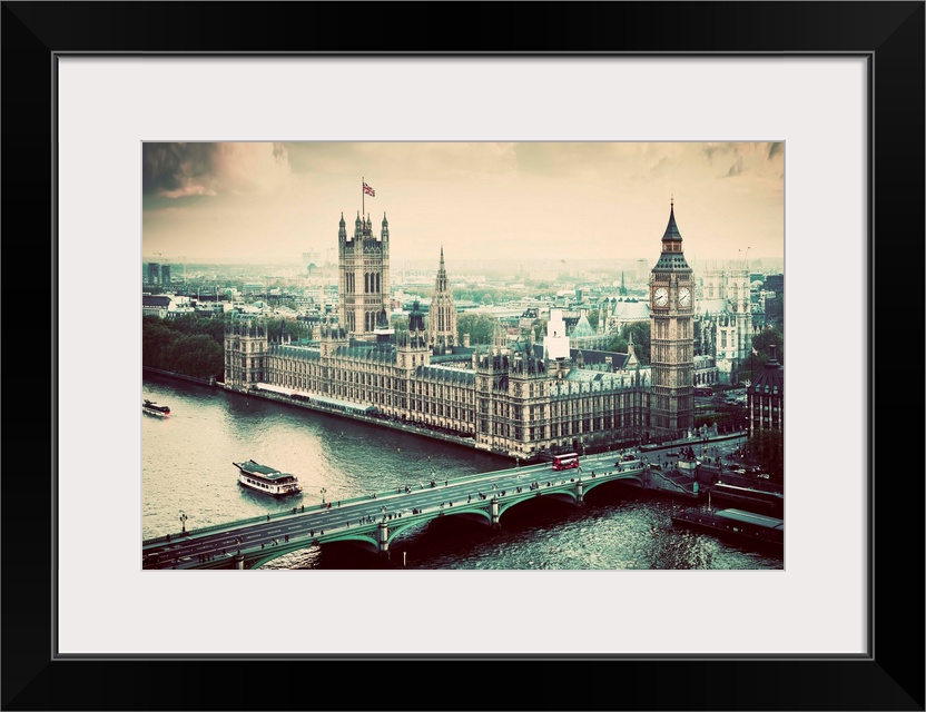 <p>London, Big Ben, the Palace of Westminster in vintage, retro style. View from the London Eye</p>