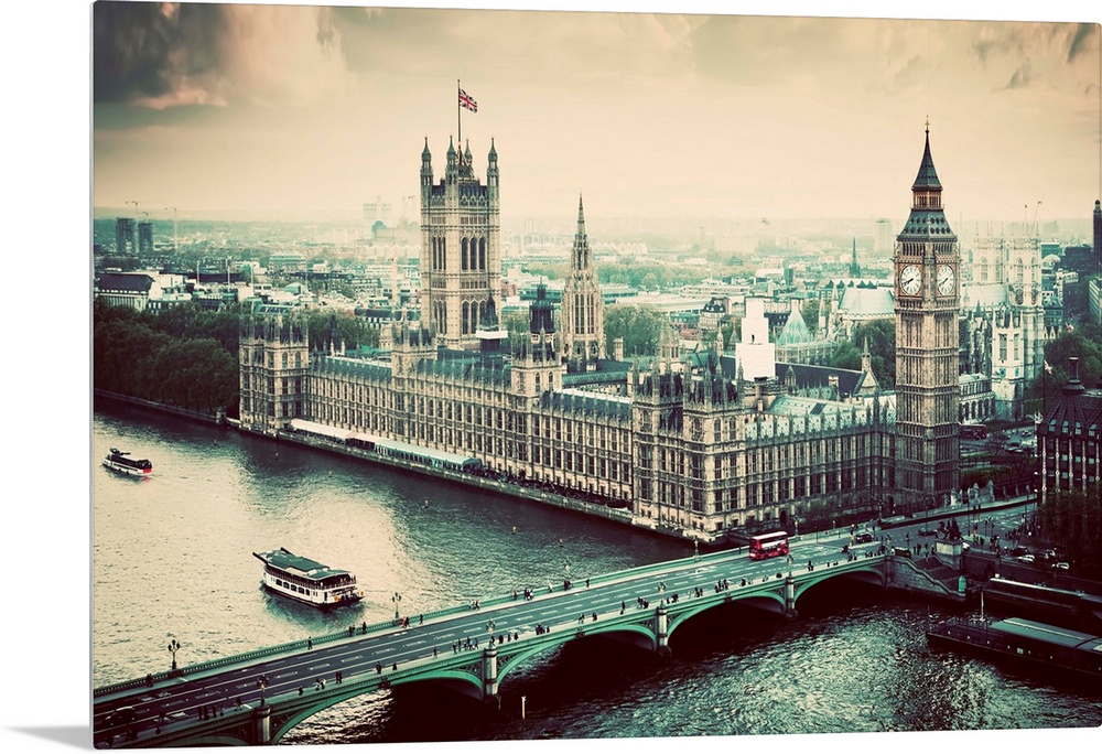 <p>London, Big Ben, the Palace of Westminster in vintage, retro style. View from the London Eye</p>