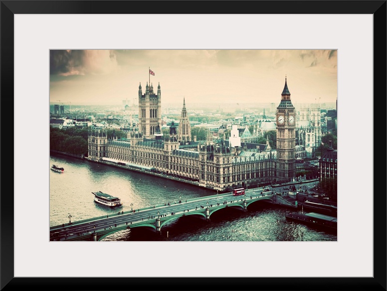 <p>London, Big Ben, the Palace of Westminster in vintage, retro style. View from the London Eye</p>