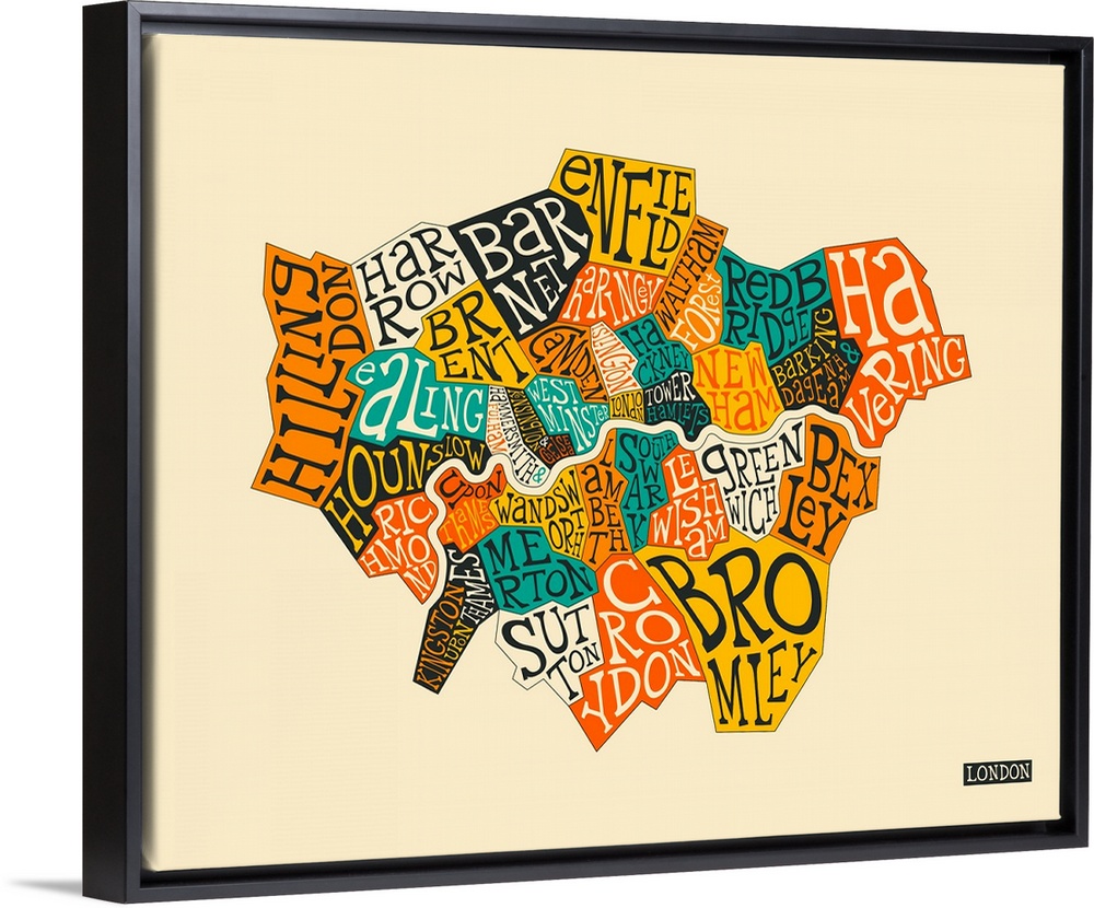 <p>Illustrated map of London, England sectioning out the different neighborhoods, with the name of each neighborhood written in the appropriate area.</p>