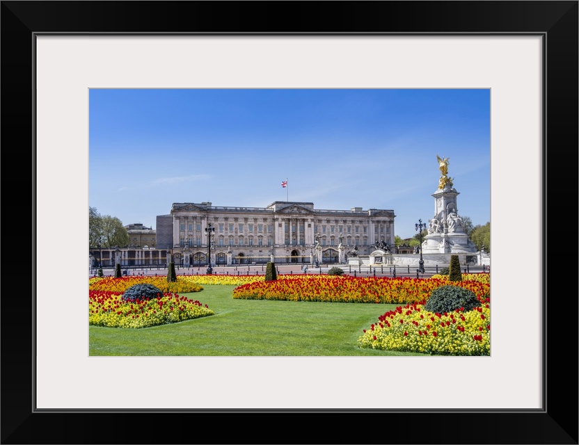<p>United Kingdom, England, London, Buckingham Palace, facade of the palace in Spring showing the flower gardens and the Victoria Memorial</p>