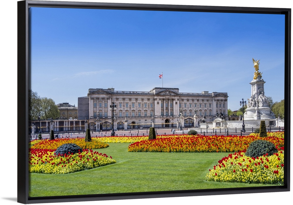 <p>United Kingdom, England, London, Buckingham Palace, facade of the palace in Spring showing the flower gardens and the Victoria Memorial</p>