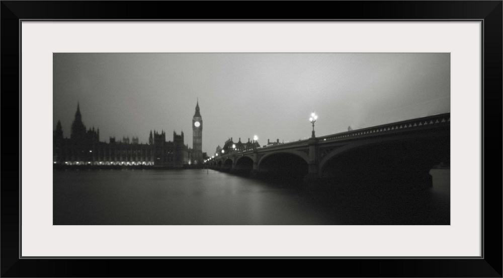 <p>A monochrome black and white sepia toned night time image of the Houses of Parliament, London, England from the River Thames.</p>