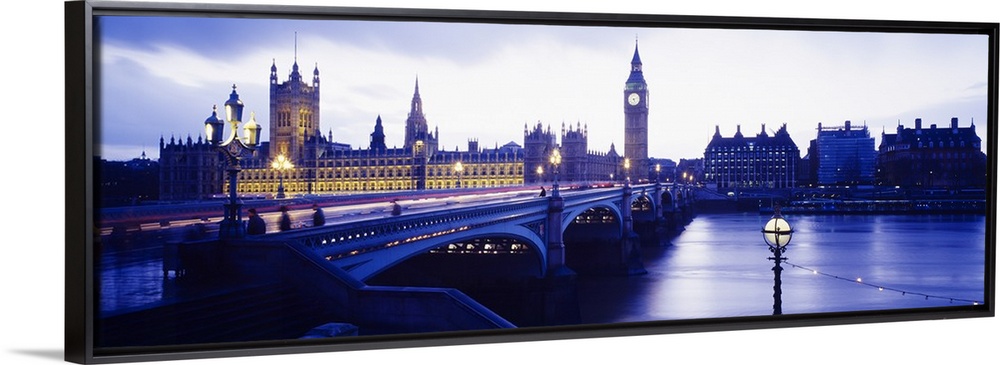 <p>London skyline with the Houses of Parliament and Big Ben. Panoramic image taken at dusk with light trails on the bridge over the Thames.</p>