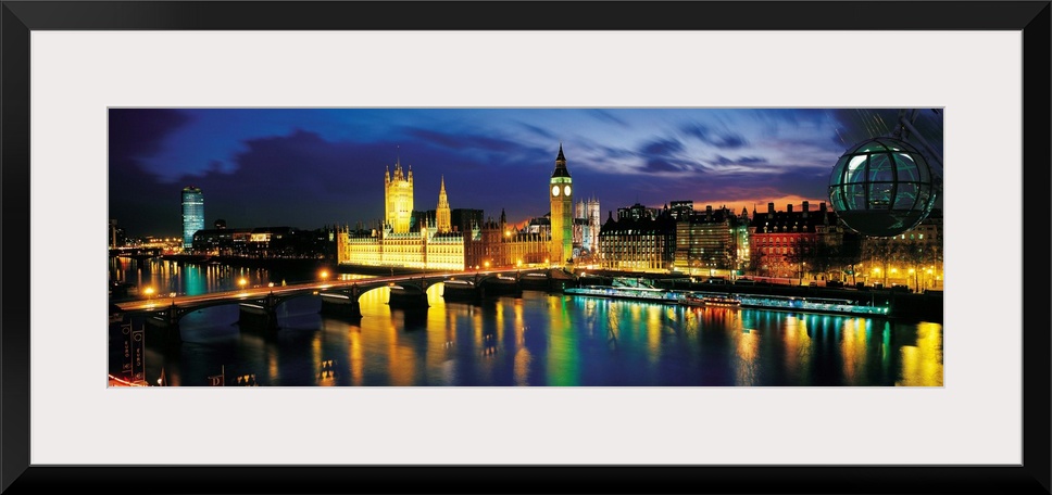 <p>Panoramic photograph shows the colorful lights across the skyline of London, England at dusk. Landmarks including Big Ben, Halls of Parliament and Westminster Palace can be seen reflecting over the Thames River.</p>