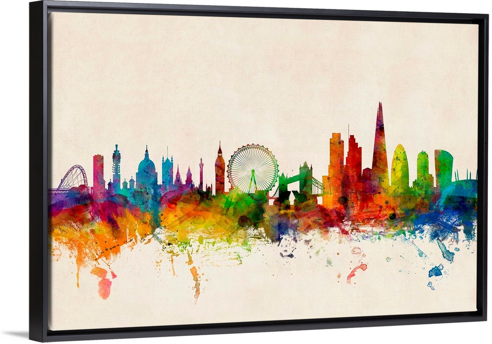 <p>Contemporary piece of artwork of the London, England skyline made of colorful paint splashes.</p>