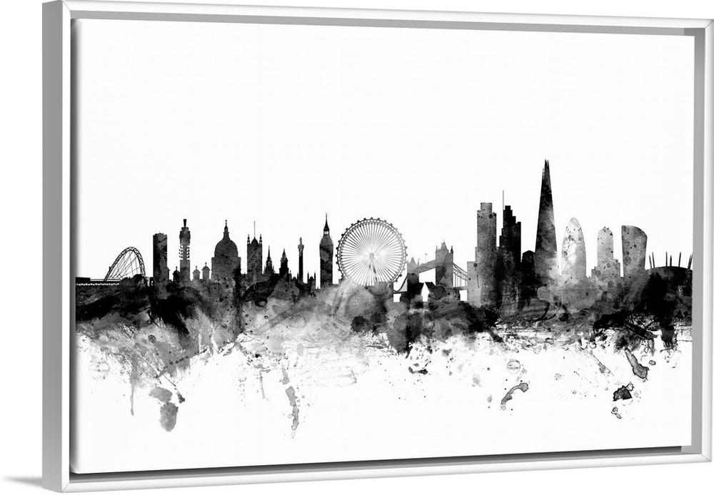 <p>Contemporary artwork of the London city skyline in black watercolor paint splashes.</p>