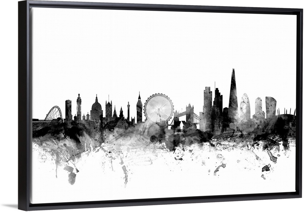 <p>Contemporary artwork of the London city skyline in black watercolor paint splashes.</p>