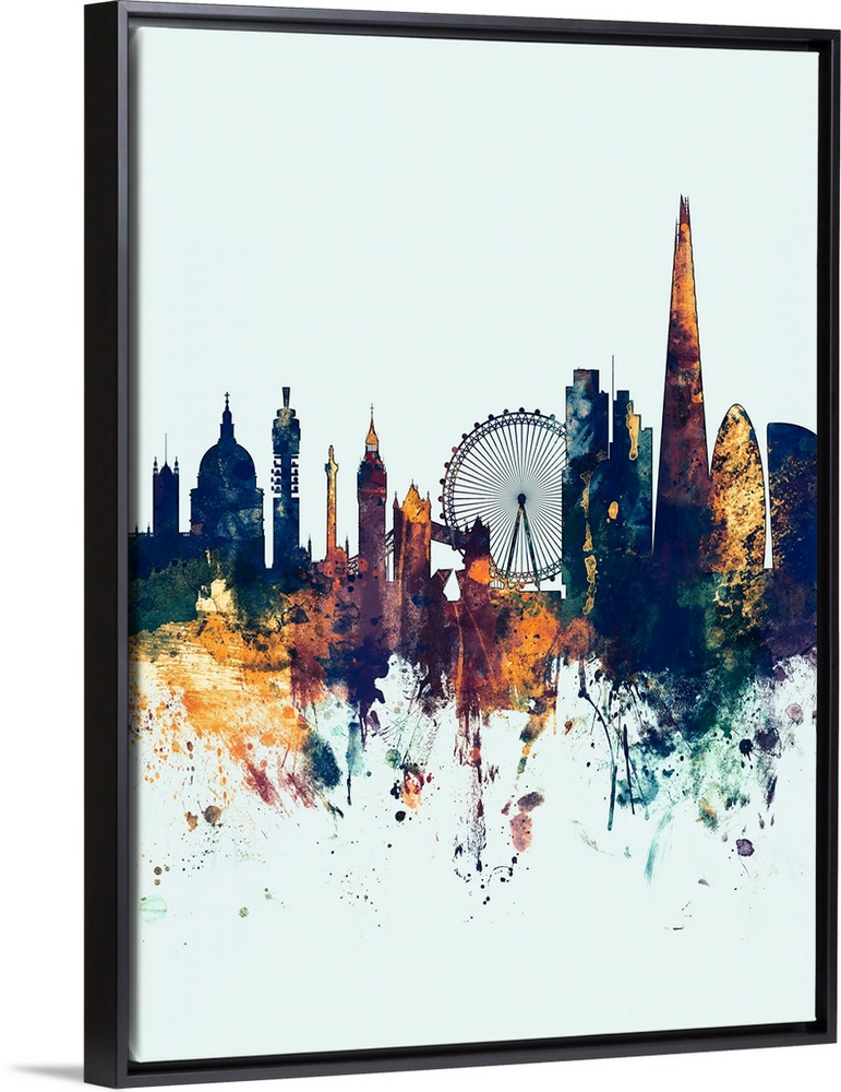 <p>Dark watercolor silhouette of the London city skyline against a light blue background.</p>
