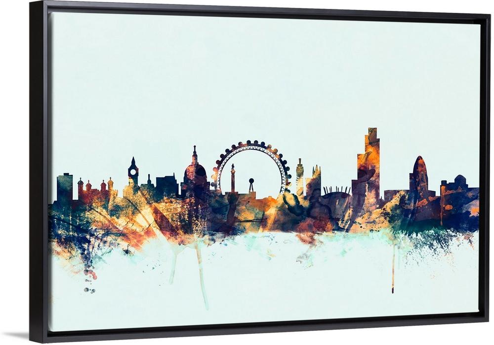 <p>Dark watercolor silhouette of the London city skyline against a light blue background.</p>