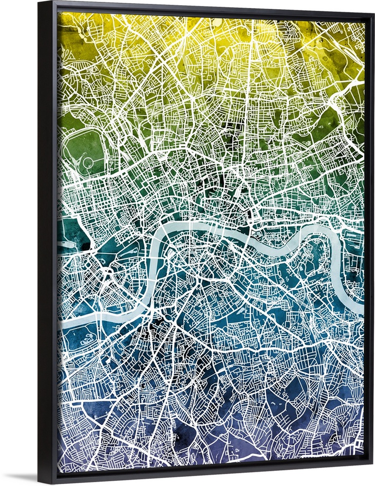 <p>A watercolor street map of London, England</p>