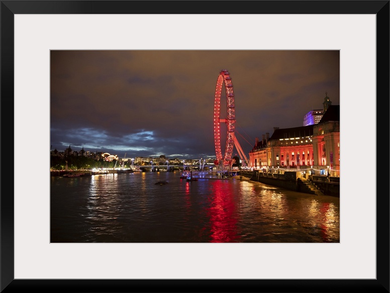 <p>London Eye ferris wheel illuminated by red light on the shores of the River Thames; London, England.</p>