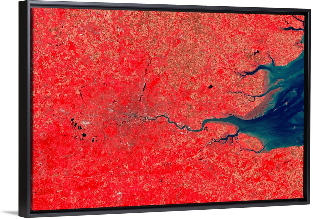 <p>London and its surrounds, infrared satellite image. North is at top. The Thames Estuary is at right. This view is used for studies of vegetation, as different types and densities of plants reflect infrared light in different ways. Coniferous forests appear darker red than hardwoods. Deep red hues indicate dense vegetation, while lighter reds indicate grasslands or sparsely vegetated areas. Image data obtained on 13 September 2002 by the Enhanced Thematic Mapper Plus (bands 4, 3, 2) on NASA's Landsat 7 satellite. For a true-colour and an alternative infrared version of this view, see images C016/3888 and C016/3890. Courtesy of NASA / ROBERT SIMMON / USGS.</p>