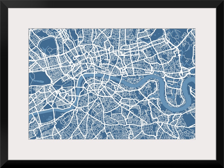 <p>A big map of London showing the network of roads, streets and waterways on canvas.</p>