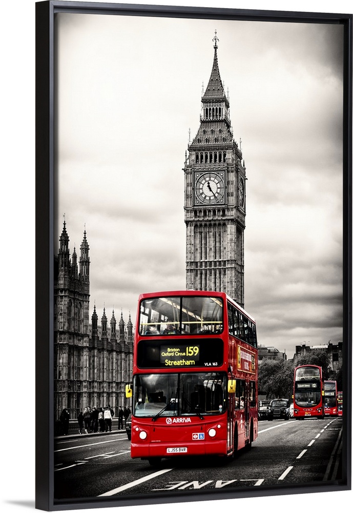 <p>Photograph with selective color of the iconic double decker bus driving past Big Ben in London.</p>
