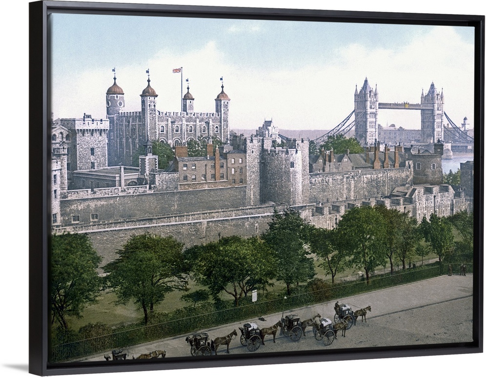 <p>A vintage urban landscape photograph of the Tower of London with horse drawn carts outside that has been tinted with colors during the development process.</p>