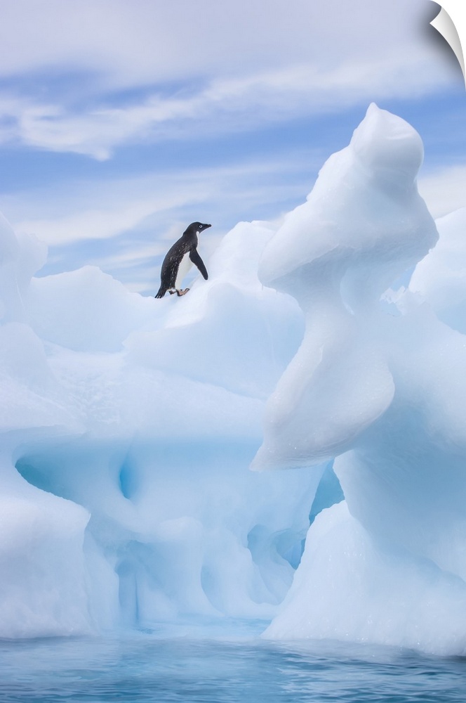 <p>Lone Adelie penguin (Pygoscelis adeliae) standing on spiral sea ice sculpture looking upward to the soft blue sky, taken from a Zodiac Boat in the South Orkney Island. Adelie Penguins are the smallest of the penguins living on the Antarctica continent. They are about 28 inches tall and weigh about 8 to 9 lbs and have a white belly with a black head and back Antarctic Peninsula, Antarctica</p>