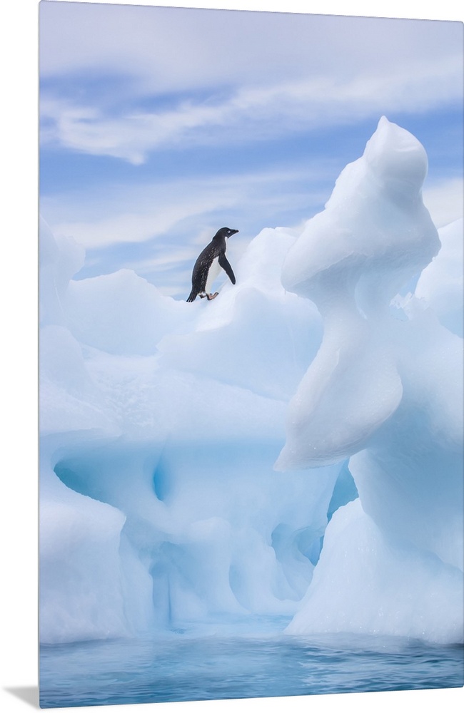 <p>Lone Adelie penguin (Pygoscelis adeliae) standing on spiral sea ice sculpture looking upward to the soft blue sky, taken from a Zodiac Boat in the South Orkney Island. Adelie Penguins are the smallest of the penguins living on the Antarctica continent. They are about 28 inches tall and weigh about 8 to 9 lbs and have a white belly with a black head and back Antarctic Peninsula, Antarctica</p>