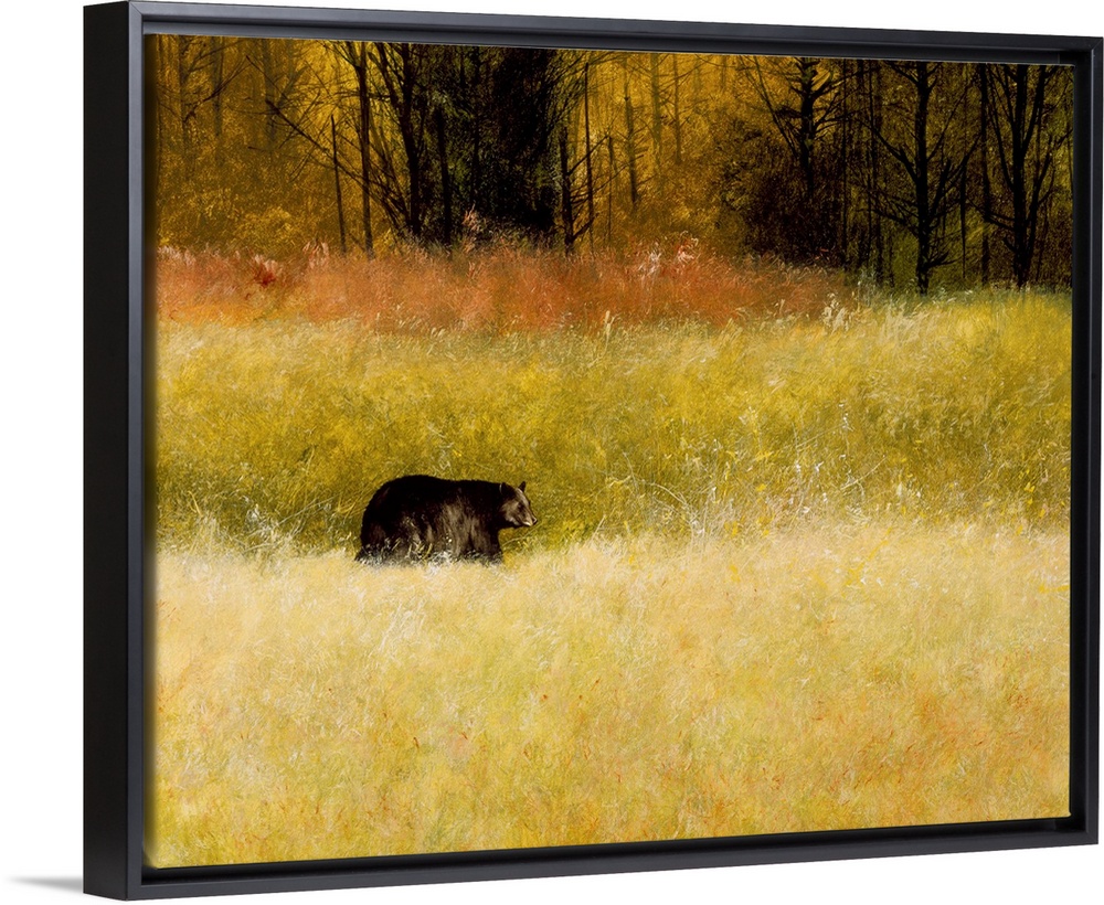 <p>Contemporary painting of a black bear walking on all fours through a field of tall grass.</p>