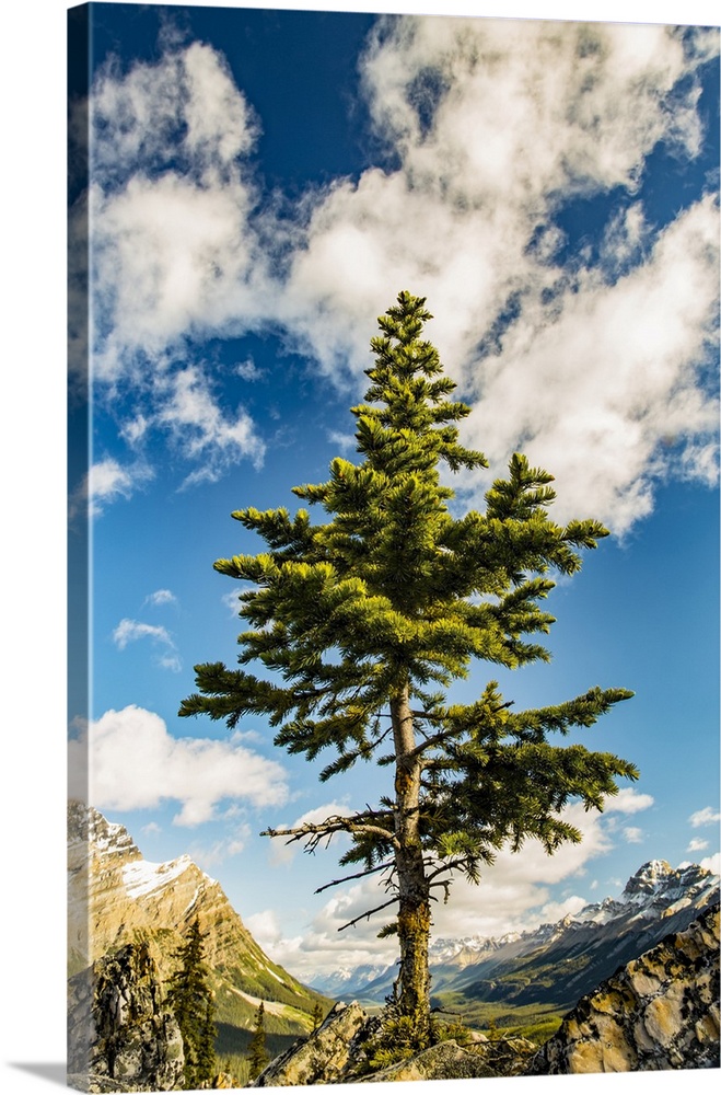 <p>A lone coniferous tree grows along a rocky ridge in the Rocky Mountains, Banff National Park; Alberta, Canada</p>