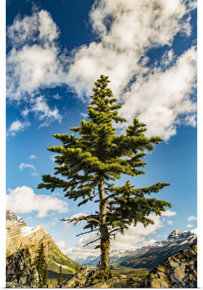 <p>A lone coniferous tree grows along a rocky ridge in the Rocky Mountains, Banff National Park; Alberta, Canada</p>