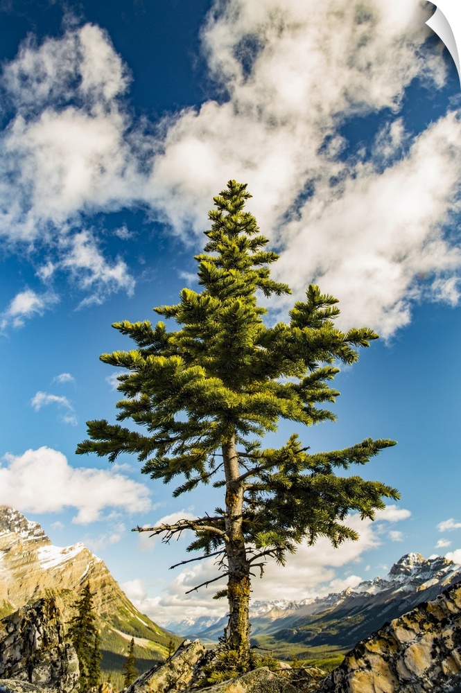 <p>A lone coniferous tree grows along a rocky ridge in the Rocky Mountains, Banff National Park; Alberta, Canada</p>