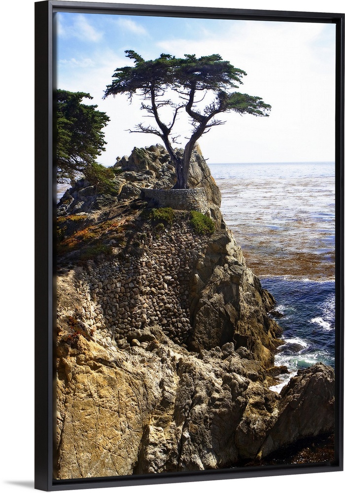 <p>Portrait photograph on a large wall hanging, of a single cypress tree at the top of a rocky cliff that overlooks blue waters and a blue, cloudy sky.</p>